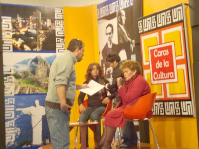 Lima (Pérou) 2010.- Sur un après midi froid et humide de l'hiver a Lima notre doux poète Miriam R. Krüger est interviewé par la sortie de son livre de poésie " Sentir" dans la chaine tv JN19 programme "Caras de la Cultura "