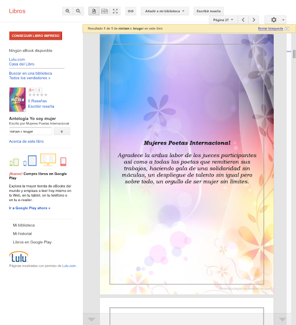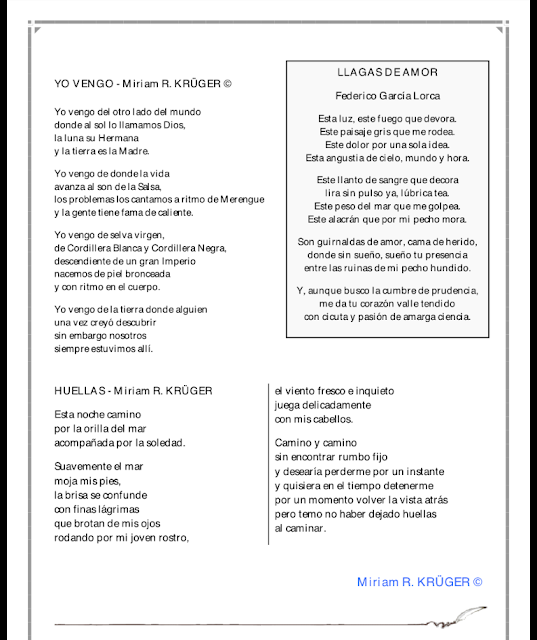 Bonjour, je suis Miriam R. Krüger et je vous souhaite la bienvenue sur mon blog personnel "MRKPOESÍA", un espace virtuel où vous pouvez trouver tout ce qui concerne mes poèmes publiés, des récitals, des projets littéraires et artistiques, etc.